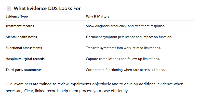 Even amid the 2025 federal shifts, the five-step disability process has not changed. DDS examiners must: